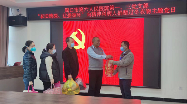 为学习贯彻党的二十大精神,更好的开展“我为群众办实事”活动,促进医院精神文明建设及帮贫扶困工作开展,2022年12月2日,我院第一党支部、第三党支部联合开展“衣旧情深、让爱循环”主题党日活动,为在院精神障碍患者捐赠过冬衣物,为他们送去党的关爱和严冬的温暖。